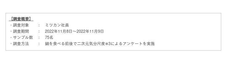 「鍋を食べるとへこんだ気持ちがホッとするのでは?」という凹んでない課メンバーの気づきをもとに、ミツカン社員75名に対し「鍋を食べる前後」でどのような気持ちの変化があるのか、立命館大学マネジメント学部 和田教授監修のもと、実証実験を行いました。