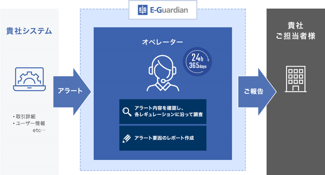 本サービスは、24時間365日の監視体制で、各社が導入する取引モニタリングシステムのアラート内容に基づき管理画面上で取引歴等を調査、調査結果の報告を行う事で健全な取引実現をサポートします。