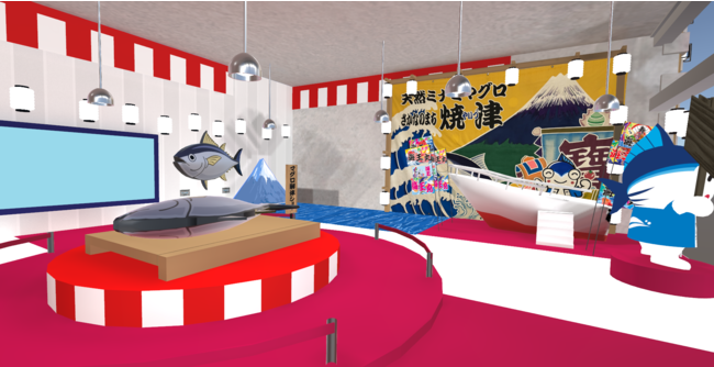 ブース内では前回大好評だった「バーチャルマグロ解体ショー」に加え、船の上からマグロを釣ることができる「バーチャルマグロ一本釣り」も行えるようになり、さらに臨場感のあるメタバースならではの体験が可能に!魚の街・焼津により親しんでいただけるような体験をご提供します。そのほか、焼津市のふるさと納税返礼品として人気の高い「ネギトロ」や「カツオのたたき」、「生しらす」など自慢の地場産品6点を3Dモデルで展示。ブース内にあるデジタルポスターから直接ふるさと納税寄附サイトに遷移し、その場で寄附を実施することが可能です。
