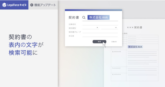 AI契約管理システム「LegalForceキャビネ」 を提供する株式会社LegalForce(本社:東京都江東区 代表取締役:角田望、以下LegalForce)は、「LegalForceキャビネ」にアップロードされた契約書本文中の表内の文字を検索できるよう、検索機能をアップデートいたしました。