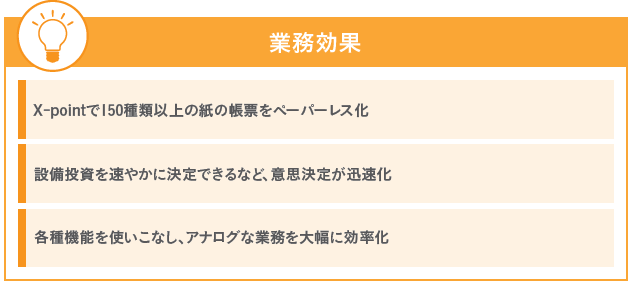 また、X-pointの書類制御機能を活用することで、申請業務以外のアナログな業務の見直しも実現し、当初の目的であった全社的なペーパーレス化を大幅に推進されています。