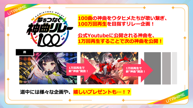 YouTube上で1曲ずつ公開される"神曲"を、1万回再生することで順次解放していくリレー式の展開となります。