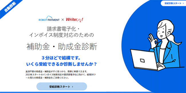 請求・債権管理クラウド「請求管理ロボ」を提供する株式会社ROBOT PAYMENT(本社:東京都渋谷区、代表取締役:清久 健也、以下ROBOT PAYMENT)は、中小企業のインボイス制度対応における補助金・助成金制度の活用を支援するため、「インボイス制度対応に向けた補助金・助成金自動診断サイト」を開設いたしました。