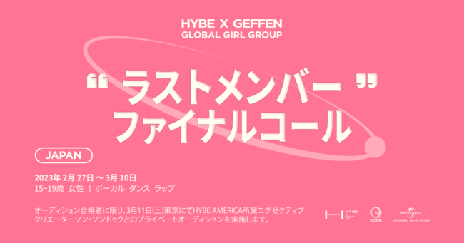 HYBEとユニバーサルミュージックグループによる「HYBE x GEFFEN グローバル・ガールグループ・プロジェクト」は、日本での最終オーディションを開催し、本日2月27日〜3月10日までの期間、オンラインによる一次選考の応募を受け付けます。