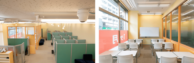 個別指導塾の森塾は創業当初から「安心安全な教室運営」をとても重要と考えております。外観はガラス張りでポスターなどの掲示を極力控えており、外部から見通しがよく、明るい空間を確保しています。教室内に背の高い仕切りを置くことを極力減らし、指導ブース・職員を一つの空間とすることで、閉鎖空間ができづらい配置となっています。
