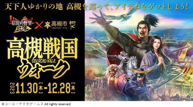 高槻市が展開する観光プロモーション「BOTTOたかつき」とスマートフォン向け位置情報アプリゲーム『信長の野望 出陣』とのコラボ企画「高槻戦国ウォーク」が11月30日(木曜日)から開催。ゲームアプリを起動して、イベント期間内(12月28日まで)に高槻の戦国スポットを巡るとアイテム(各スポット・小判100枚)がゲットできます。