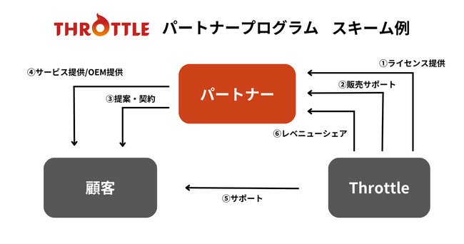ビジネスマッチングによるレベニューシェアのほか、販売パートナーにはThrottleのOEM提供による自社商材との組合せ・強化が可能です。また、Relicホールディングスが持つ新規事業の立ち上げから成長・拡大、事業再生といった一気通貫の機能を紹介・連携できます。
