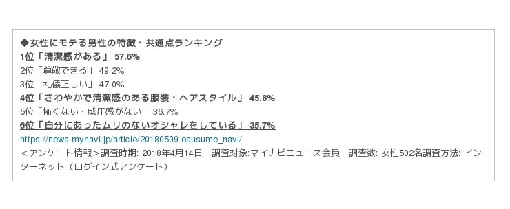 女性にモテる男性の特徴として上位に上がっている、1位、4位、6位は「清潔感」「さわやか」「ムリのないオシャレ」など身だしなみに関わるものが多く、女性にモテるには顔立ちやスペックなどではなく、「清潔感」がキーワードだといえることがわかります。