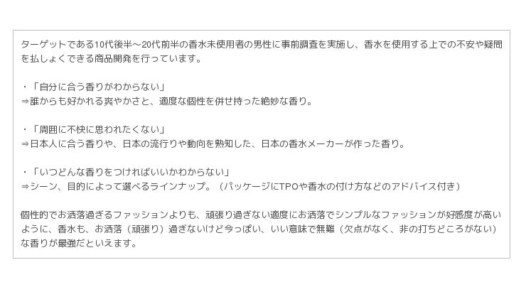 飽和状態といわれるレディースコスメ市場に対し、メンズコスメ市場は市場開発の余地が大きく、メンズ香水も高い伸び率で市場を拡大しています。