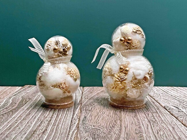 雪だるま型のガラスボトルの中に、ふわふわのコットンやゴールドやシルバーに染色した植物を閉じ込めたユニークなオブジェ。クリスマスが終わっても冬の間楽しむことができそうですね。