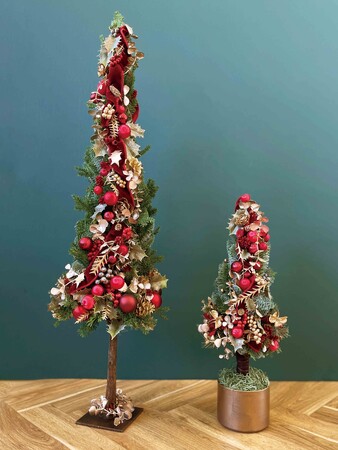 ベルベット調のリボンをセンターに配置し、流れに沿ってオーナメントをデザインしたクラシカルなツリー。