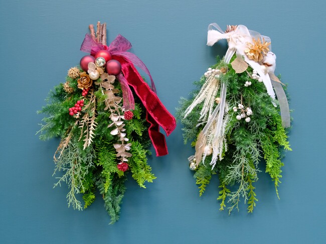 左はフローリストが一つ一つ手作りで仕上げたスワッグ。右はご自分で作って楽しむキットです。詳しいレシピ付きですので気軽にお楽しみいただけます。