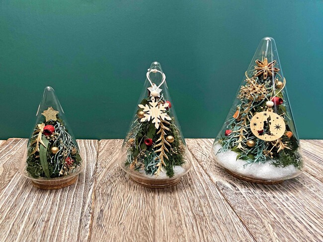 ツリー型のガラスボトルの中に、小さなもみの木を表現しました。オーナメントや雪の演出までフローリストがこだわって手作りしています。