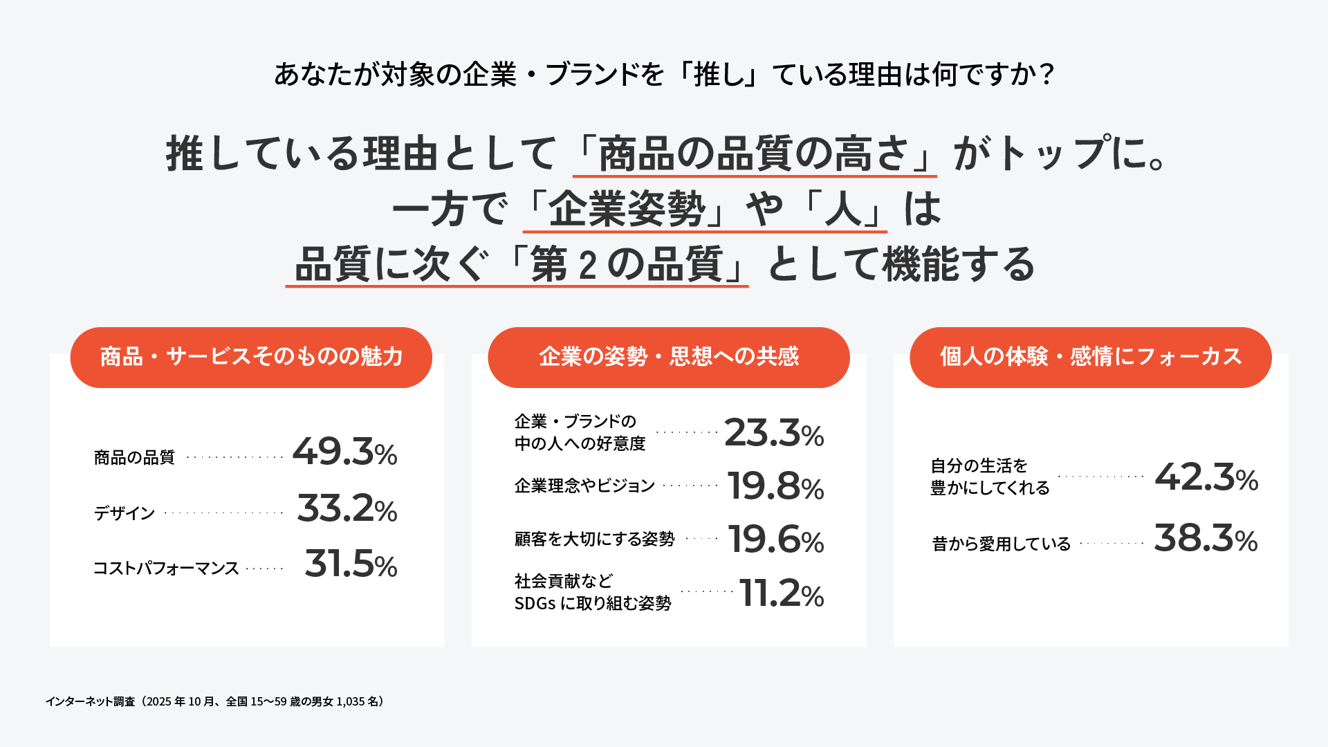5.【企業/ブランドを『推している』理由】推している理由として、「商品の品質が高さ」がトップに。一方で、「企業姿勢」や「人」は、品質に次ぐ「第2の品質」として機能する。