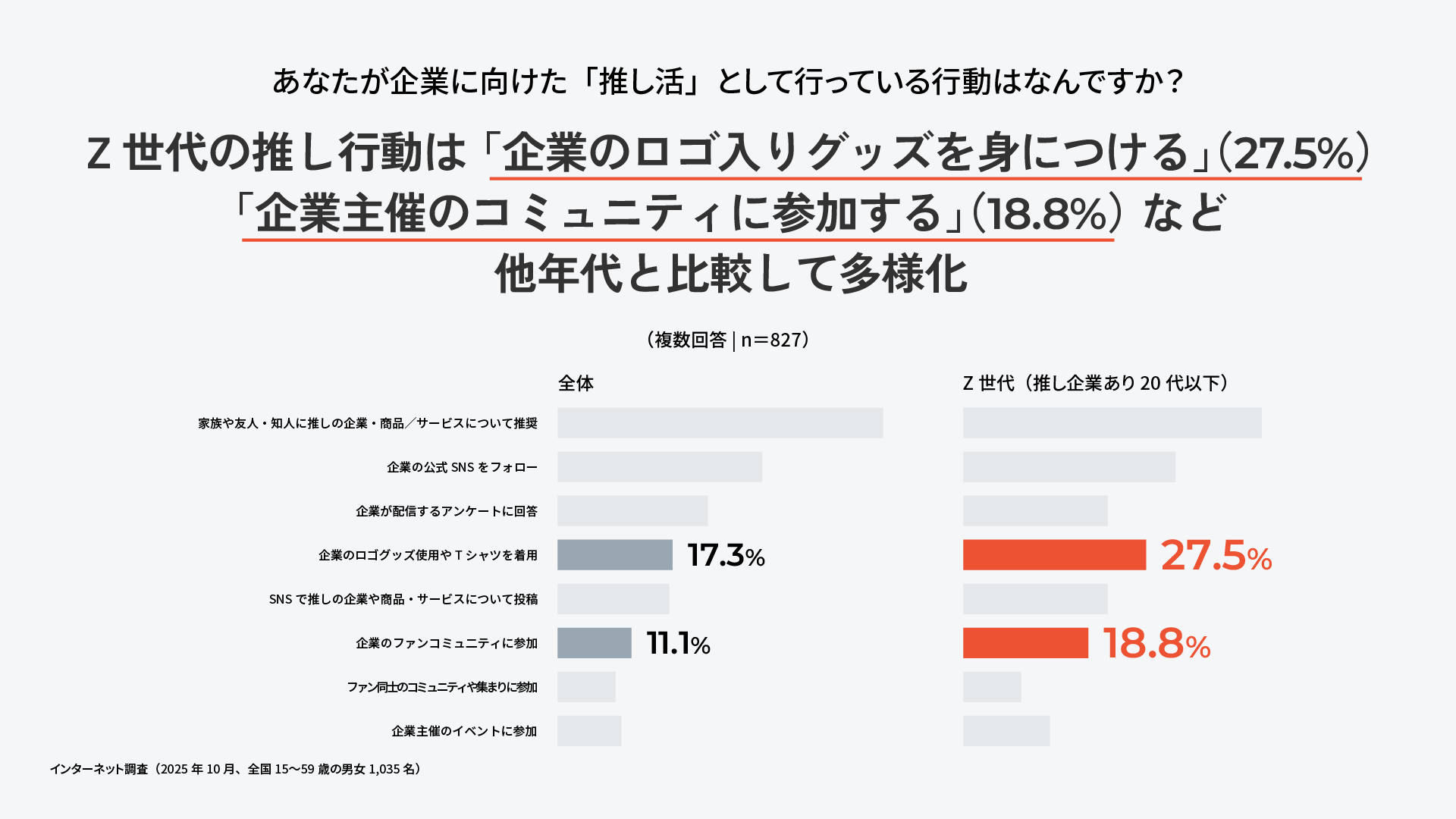 4.【企業/ブランドに対する具体的な「推し行動」について】推し活の内容としては「家族や友人・知人に推奨」「企業の公式SNSフォロー」が上位に挙がる結果に。一方で、Z世代の推し行動は「企業のロゴ入りグッズを身につける」(27.5%)「企業主催のコミュニティに参加する」(18.8%)など他年代と比較して多様化。