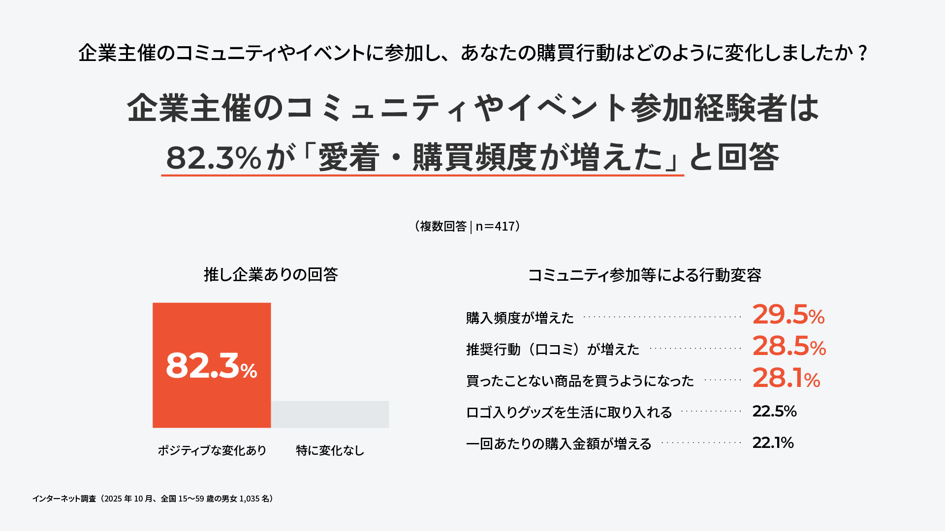 企業主催のコミュニティやイベント参加経験者は、82.3%が「愛着・購買頻度が増えた」と回答。企業との相互コミュニケーションが実際の購買行動に結びつくという結果に。