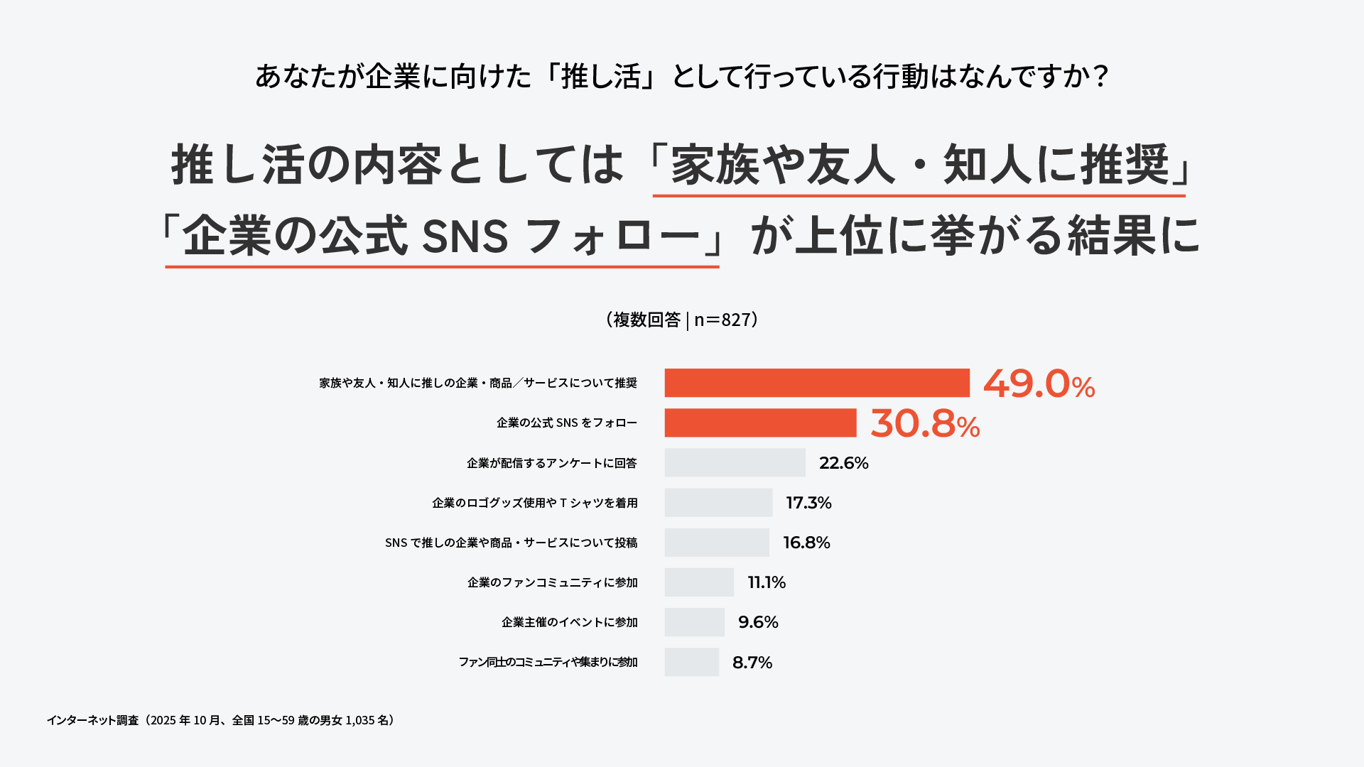 企業の推し活として具体的に行っている行動について聞いたところ、「家族や友人・知人に推しの企業・商品/サービスについて推奨すること」が全体の49.0%、「企業の公式SNSをフォローすること」が30.8%という結果に。この結果は、ファンが単なるリピーターに留まらず、企業に代わって「最も信頼性の高い広告塔」として、身近な人へ熱量を持って口コミを広げてくれる存在であることを示している。