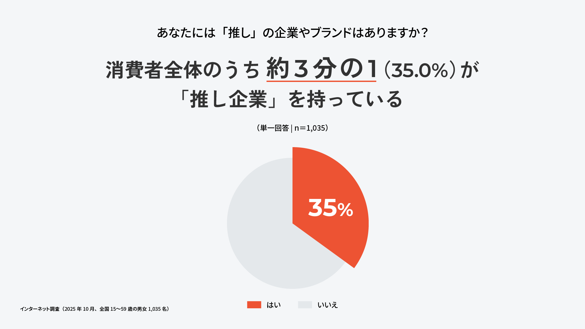 1.【「推し企業」の保有割合について】消費者全体のうち約3分の1(35.0%)が「推し企業」を持っている。なかでも若年層ほど「推し企業」を持つ傾向が顕著で、Z世代の消費者は約半数に。
