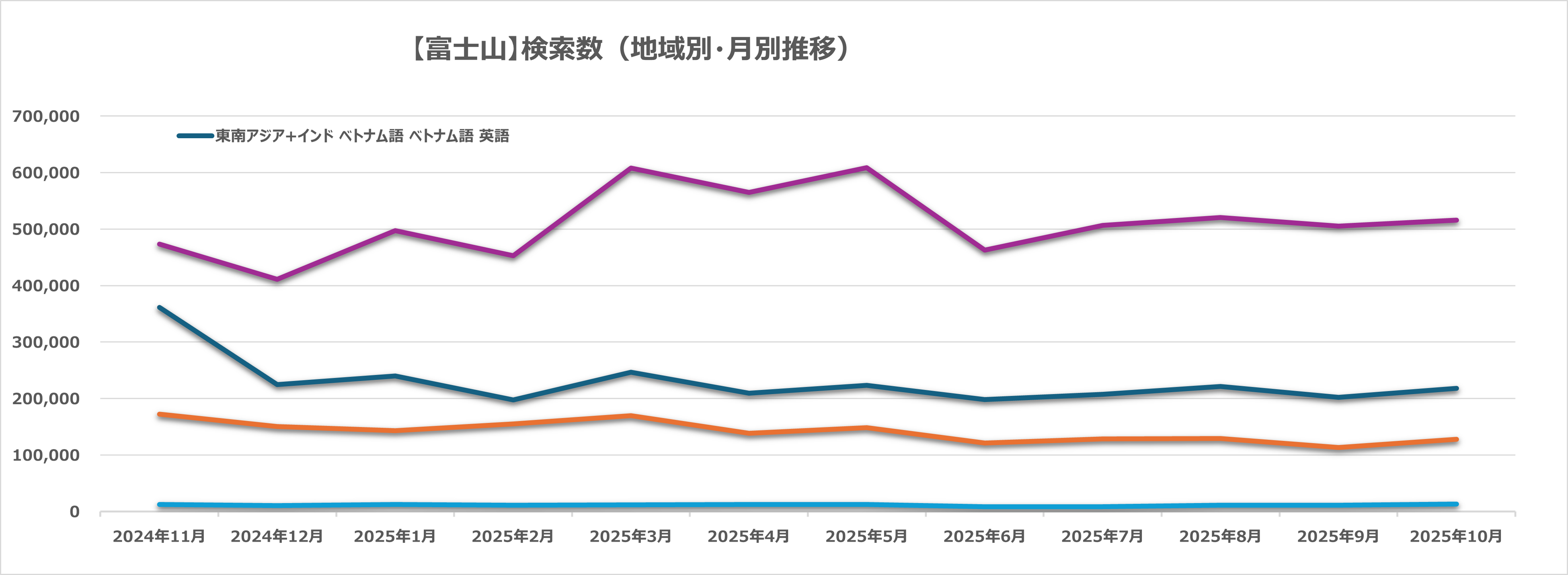 一方、東アジア+インドは年間を通じて安定した検索ボリューム(約20万〜35万件)を維持しています。