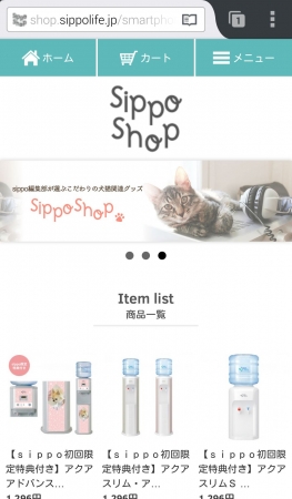これまでのペット関連商品の紹介コーナー「sippo セレクション」を発展させ、「sippo shop」をオープンさせました。「セレクション」ではsippo編集部が選りすぐったこだわりのペットグッズを紹介していましたが、「shop」では直接購入もできます。飼い犬や飼い猫をモデルにした指輪や表札、印鑑など、オリジナルグッズを多数取り扱っています。