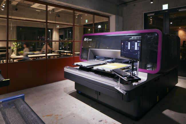 プラザクリエイトは、原宿・神宮前にアパレルファクトリー&カフェの「HATTO CREATIVE PLAZA」を運営しています。この施設の注目ポイントは、最先端の衣類プリンターであるイスラエル製のAtlas MAX(アトラスマックス)を導入していること。必要な時に必要な分だけ印刷できる「オンデマンドプリント」が可能で、無駄を出しにくいものづくりに励んでいます。