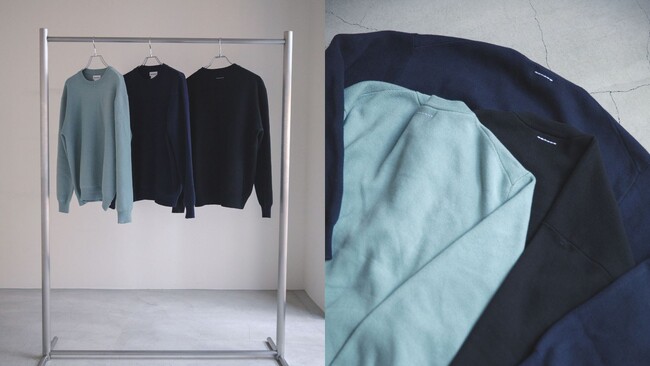 素材は、コットン×カシミヤの糸を使用しており、非常に細かい編み地で滑らかな質感が特長です。細かく密度が高いことで、薄手でありながらしっかりとした暖かさも感じられます。