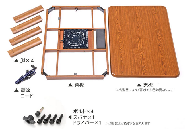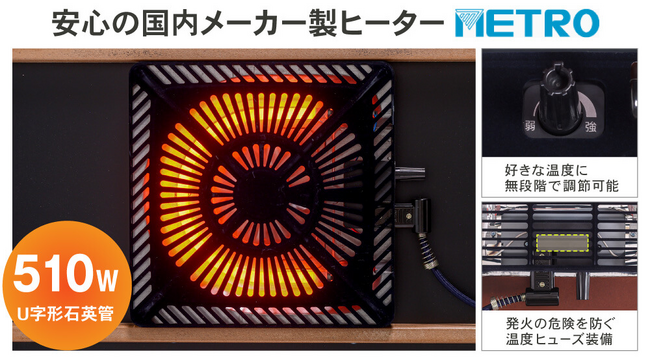 国内メーカー製のヒーターは温度ヒューズを装備しており、こたつ内部の温度が上がりすぎた場合は、火災の発生などを防ぐ為にヒーターへの電流を完全に遮断する安心・安全な設計となっております。