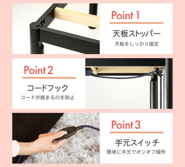 デザインだけでなくストレスの無い使用感を目指し、細部にもこだわりました。中でも、天板のガタつきを抑え、しっかり固定する為の天板ストッパー、コードの絡まりを防ぐコードフック、手元でかんたんに電源のON/OFF操作ができる手元スイッチなど、標準装備として定番のこの3点を、定番だからこそ大切にこだわりました。