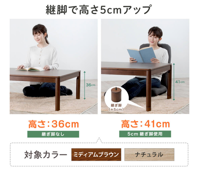 ミディアムブラウンとナチュラルの2色には5cmの継ぎ脚が同梱されており、セットすることで高さ調整が可能となっております。継ぎ脚なしの場合は高さ36cmで、床やカーペットに直接座った場合に最適な高さです。そして継ぎ脚を使用した場合の高さは41cmと座椅子などを使用した場合にちょうどいい高さとなっており、用途に合わせた調整が可能でございます。