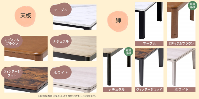 マーブル、ミディアムブラウン、ナチュラル、ヴィンテージウッド、ホワイトの5色展開です。