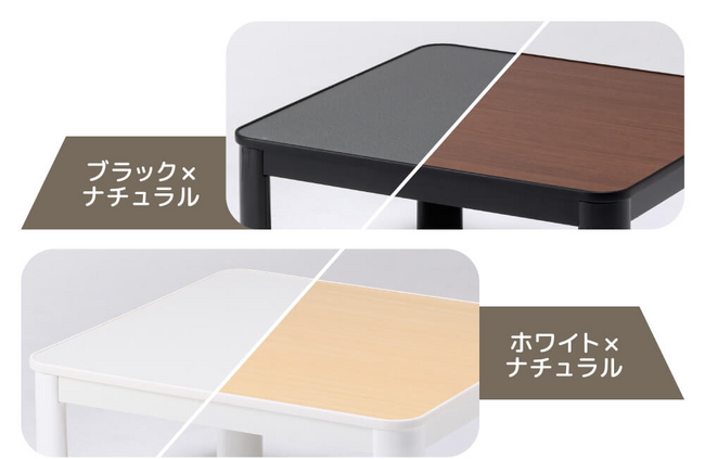 70cm×70cmのサイズのみ、天板がリバーシブルで使えるブラック×ナチュラルとホワイト×ナチュラルのカラーを2色ご用意しております。ご気分に合わせてお好きな方でご使用いただけます。