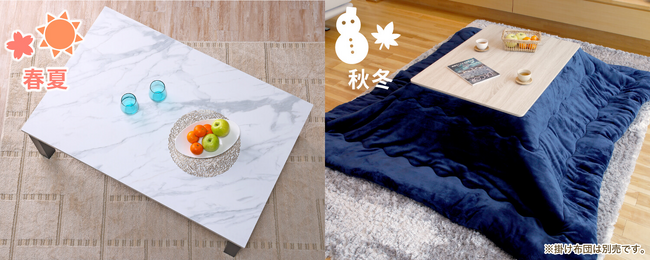 シンプルで飽きのこないおしゃれなデザインは、どのようなインテリアにも馴染みます。また、オフシーズンにはテーブルとしてもお使いいただけますので、1年を通して大活躍します。
