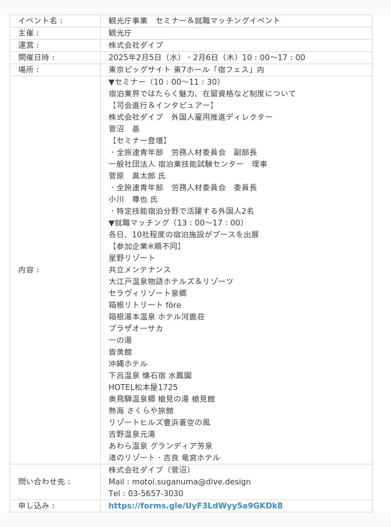 全国約4,600以上の観光施設に特化した人材サービス事業を展開する株式会社ダイブ(東京都新宿区、代表取締役社長:庄子潔、証券コード151A、以下「ダイブ」)は、観光庁が主催する特定技能の宿泊分野に関するセミナーおよび特定技能人材と宿泊施設の就職マッチングイベントを運営し、2月5日(水)・2月6日(木)に開催される「宿フェス」内で実施いたします。