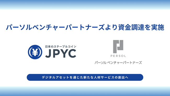 日本円連動ステーブルコイン『JPYC』を取り扱うJPYC株式会社(東京都千代田区、代表取締役:岡部 典孝)は、パーソルベンチャーパートナーズ合同会社(本社:東京都港区、代表パートナー:加藤 丈幸)を引受先とするJ-KISS型新株予約権による資金調達を実施したことをお知らせします。なお、パーソルベンチャーパートナーズは、総合人材サービスのパーソルホールディングス株式会社(本社:東京都港区、代表取締役社長 CEO:和田 孝雄)の100%子会社になります。