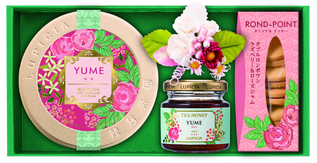 (紅茶[ゆめ]50g缶入、クッキー[ダブルロンボワン ラズベリー&ローズジャム]5枚入り、ティーハニー[ゆめ]75g瓶入、ブーケ)