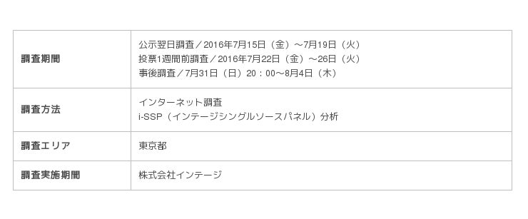 株式会社インテージ(本社:東京都千代田区、代表取締役社長:石塚 純晃)は、18歳から69歳までの男女に対して、2016年度東京都知事選挙についてのインターネット調査を行いました。本調査は、公示日翌日・投票1週間前・投票直後の3回調査することで、支持がどのように変わっていったのかを分析しました。