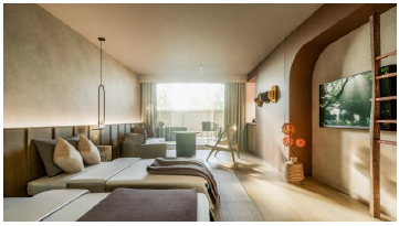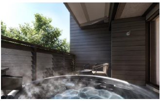 客室デザインは、落ち着いた木目とベージュトーンのカラースキームの中に、柔らかな曲線形状壁やアートがアクセントとなっており、温かみのあるアンビエント照明と信楽焼温泉露天風呂付の客室では自然の中に溶け込むようなくつろぎ体験をお楽しみいただけます。