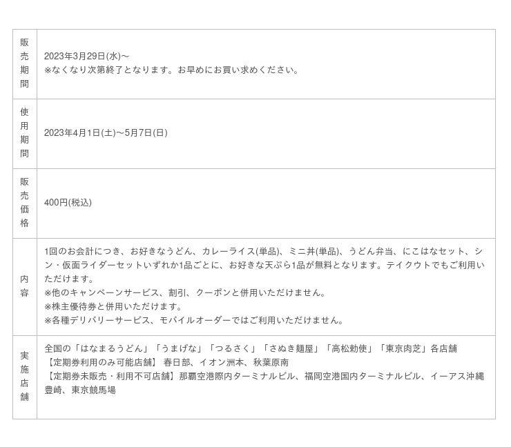 毎春恒例の天ぷら定期券を1枚400円(税込)で3月29日(水)より先行販売をいたします。天ぷら定期券はお好きなうどん1杯お買い上げごとに、お好きな天ぷら1品が無料となります。最大で37日間(4月1日(土)〜5月7日(日))、期間中でしたら何度でもご使用いただけます。