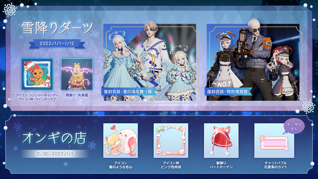 2021年12月30日(木)〜 2022年1月12日(水)の期間で3つの期間限定特典を購入可能!購入すると「時の欠片」、「天命の結晶」、「精錬元素」、「不変の欠片」、「アイコン·瞳に落ちる雪」などのレアアイテムを獲得できます!「時の欠片」を集めるとレアな外観アイテムと交換することができます。お正月祝福でドラブラライフをもっと楽しみましょう。
