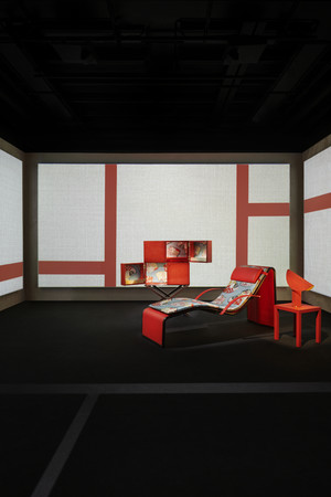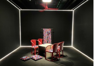 中国をテーマにしたスペースでは、東洋の美意識が抽象的に表現され、黒で統一された空間に漆塗りの「JYLIA」チェアが4つのローブを描くようなイメージで配置されています。喜びと幸運を象徴する色である赤と、黒以外の色彩のない空間が強烈なコントラストをなしています。