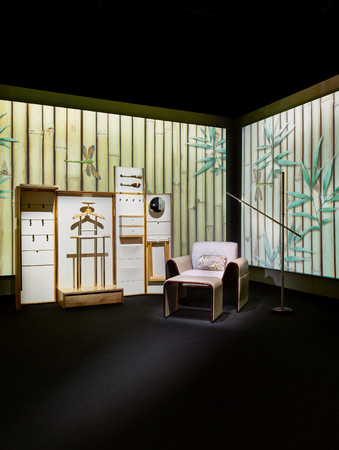 自然界もまた、アルマーニのインスピレーションの重要なテーマです。トンボが軽やかに羽を休める竹の垂直な流れは凛とした空間を作り上げます。重力の法則に逆らうような印象さえ与える軽さを表現したカナレット材の輪郭がコンパクトかつエレガントな「SHARON」 chairやレトロな魅力を持つ「SUITE」 valet standなどが展示されています。