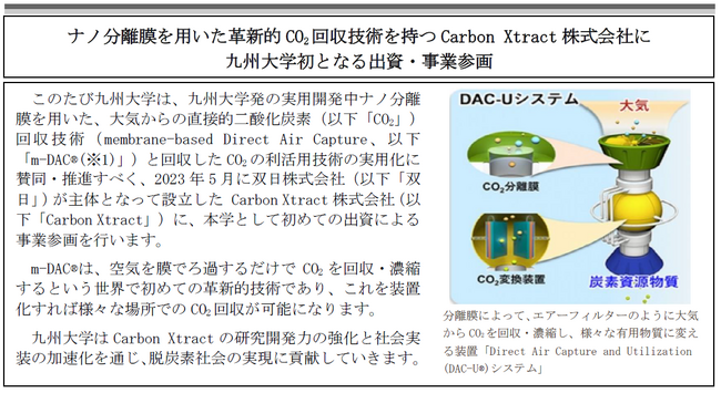 2. 2023年6月12日:「双日、ナノ分離膜を用いたDAC技術の2020年代後半の実用化に向け新会社を設立〜九州大学発の革新的技術の社会実装を加速化〜」