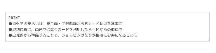レートのいい両替所を探し、長い列に並び、結局外貨を余らせてしまうという悪循環とはお別れして、安全にスマートに海外での決済手段として、積極的に選びたいところです。