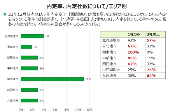 23卒12月時点のエリア別内定率は「関西地方」が最も高いことがわかった。一方、「北海道・中四国・九州地方」は、内定を複数持っている学生の割合が高くなった。
