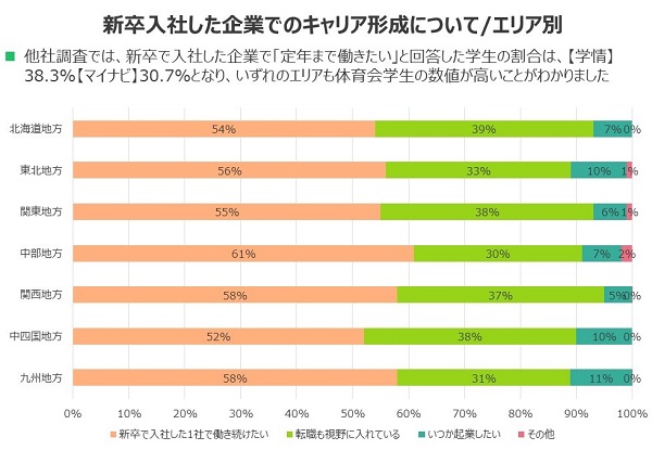 新卒で入社した企業でのキャリア形成についての質問では、各エリアで50%以上の学生が「新卒で入社する1社で働き続けたい」と回答した。また、エリア別の差は特に見られなかった。