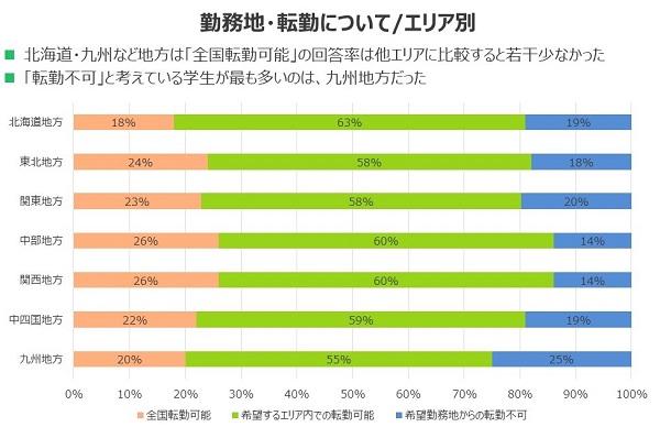 勤務地・転勤についての質問では、北海道・九州といった地方では「全国転勤可能」の回答率は都市圏エリアと比較すると若干少なかったことがわかった。また、「転勤不可」と考えている学生が最も多いのは、九州地方となった。