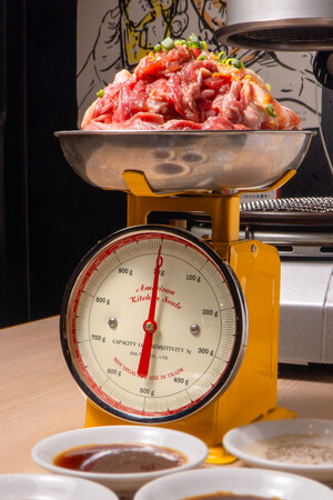 豚・鶏のカルビ肉を計りにのせて提供する「1kgカルビ」と「1kgカレー」を提供する『完璧で究極の1kgゲッターカ
