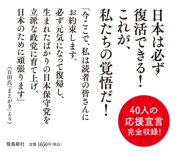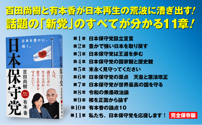 作家の百田尚樹氏とジャーナリストの有本香氏の共著『日本保守党 日本を豊かに、強く。』(1月31日、飛鳥新社刊)が事前予約開始直後と発売1週間前にして早くもAmazon総合1位を獲得!