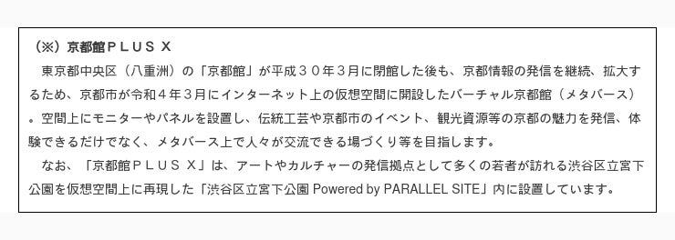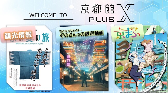 京都市、大日本印刷株式会社及び一般社団法人渋谷未来デザイン(以下「渋谷未来デザイン」という。)では、首都圏への京都の魅力発信、新たな交流拠点の創出等を目的として、バーチャル空間(メタバース)上の「京都館PLUS X」※ を活用した様々な取組を行っています。この度、TikTokクリエイターとして活躍する「ぞのさんっ」による、「京都に行きたくなる」特別動画を限定公開しますのでお知らせします。この企画は、昨年11月に渋谷未来デザイン主催で開催された「SIW2022」の渋谷アイデア会議内(京都市も参加)で提案された「バーチャル空間とソーシャルメディアを掛け合わせて京都館PLUS Xを盛り上げる」というアイデアを実現したものです。なお、本企画は京都市とTikTok Japanが連携のもとで実施した取組です。このほか、「京都館PLUS X」の展示コンテンツの入れ替えも併せて行いますので、この機会に是非アクセスしてみてください!