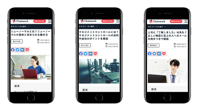 近年の社会情勢の変化で、働き方や雇用形態を見直しはじめている企業が多くあります。その中で、電話やメール、FAXなど、従来のビジネスコミュニケーションの中心を担っていた手法にも、利便性や効率化の観点で変化が求められています。このような課題感に対して、「お役立ちコラム」では、ビジネスコミュニケーションを通して、働き方を変化させるきっかけを創出することを目指して、現在「Chatworkの使い方」「ビジネスチャット」「テレワーク」「業務効率化」「働き方改革」の5つのカテゴリで、1,200本以上の記事を公開しています。